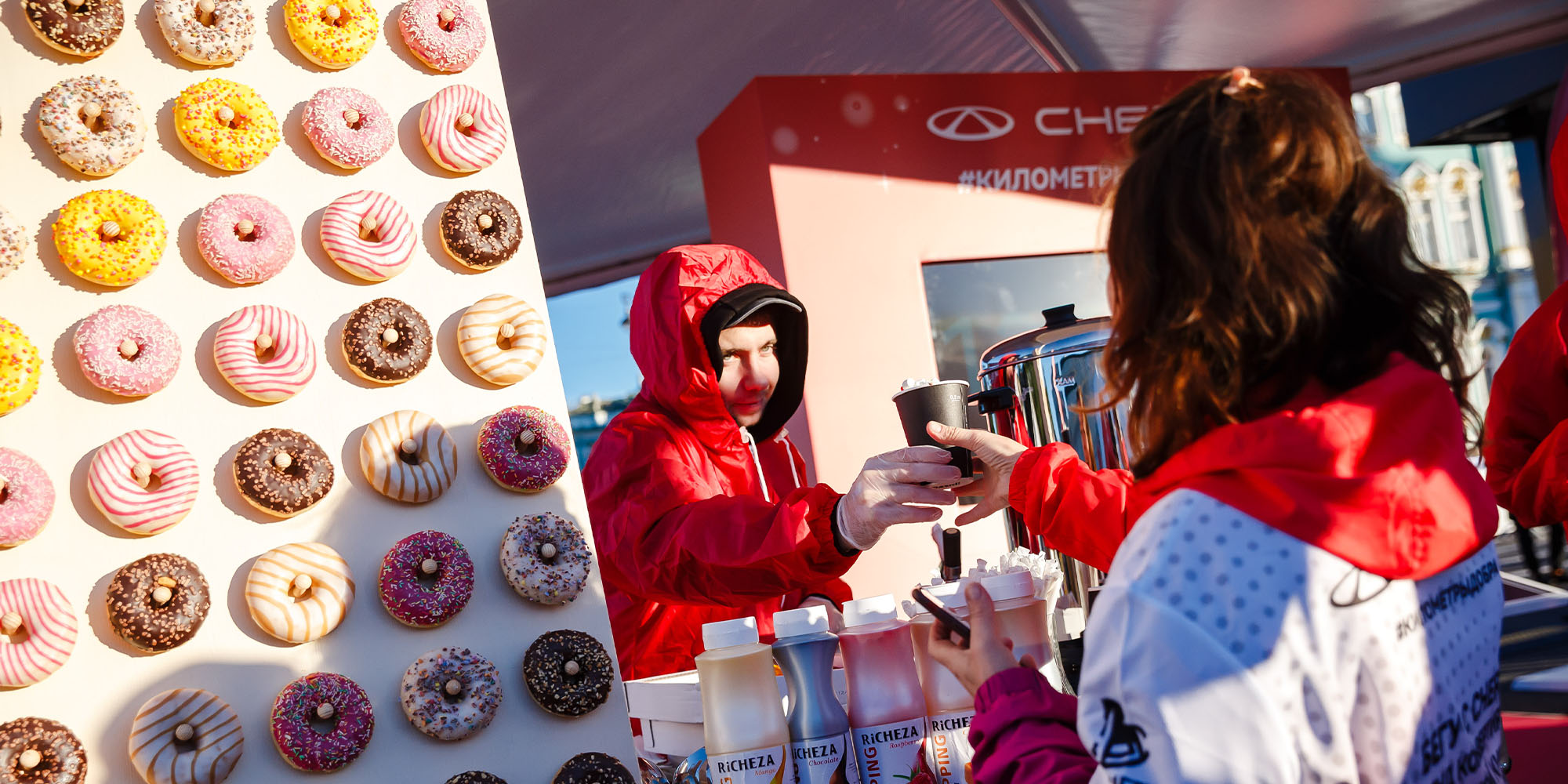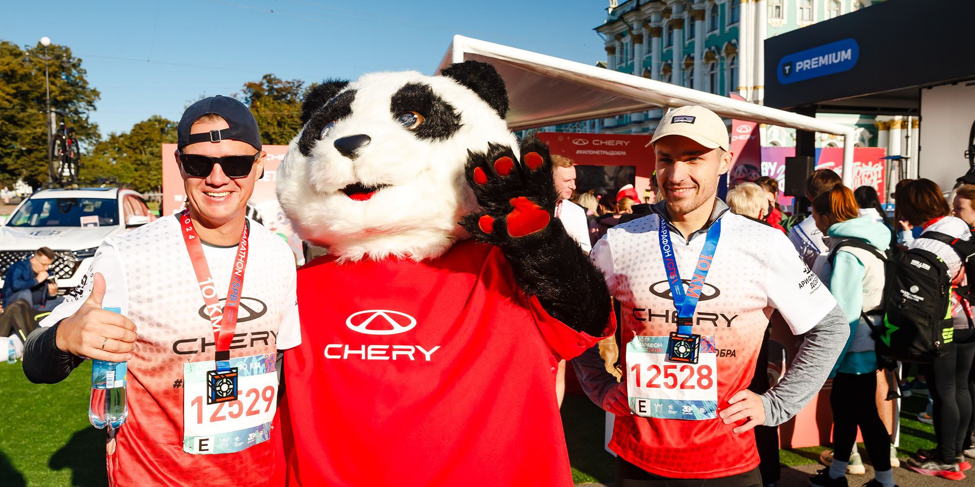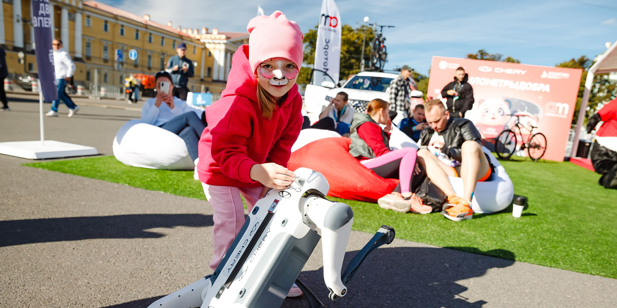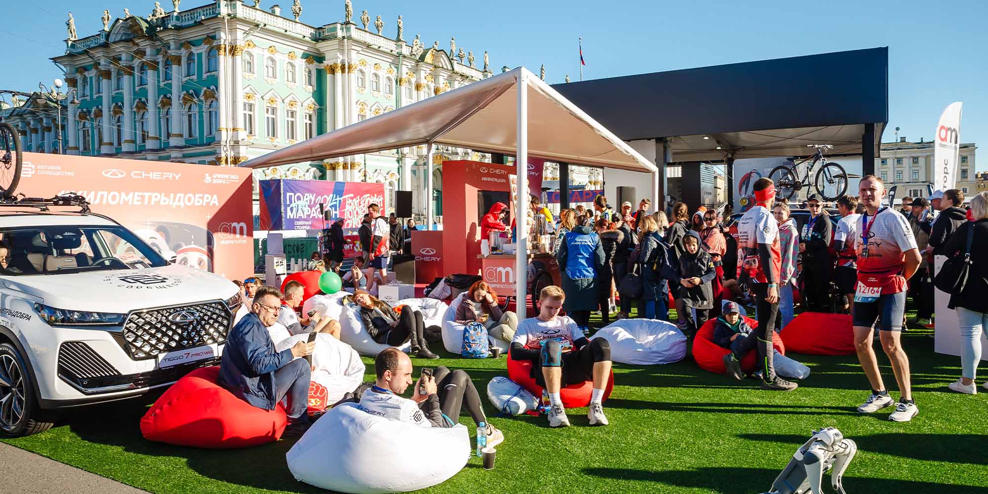 Марка CHERY во второй раз за это лето развернула свою бренд-зону на Дворцовой площади, где любой желающий мог восстановить свои силы после забега, порадовать себя какао и пончиками, пополнить заряд своего смартфона и получить ценный аксессуар для бега за подписку на социальные сети бренда, совершить пожертвование на любую сумму в фонд. Все бегуны, принявшие участие в благотворительной акции #километрыдобра, вновь стали участниками розыгрыша одного из велосипедов CHERY. А маленьких гостей развлекала игривая и доброжелательная панда CHERY, а также собака-робот CHERY по кличке Дорри. Она вызвала восторг и нескрываемое восхищение у всех участников забега.